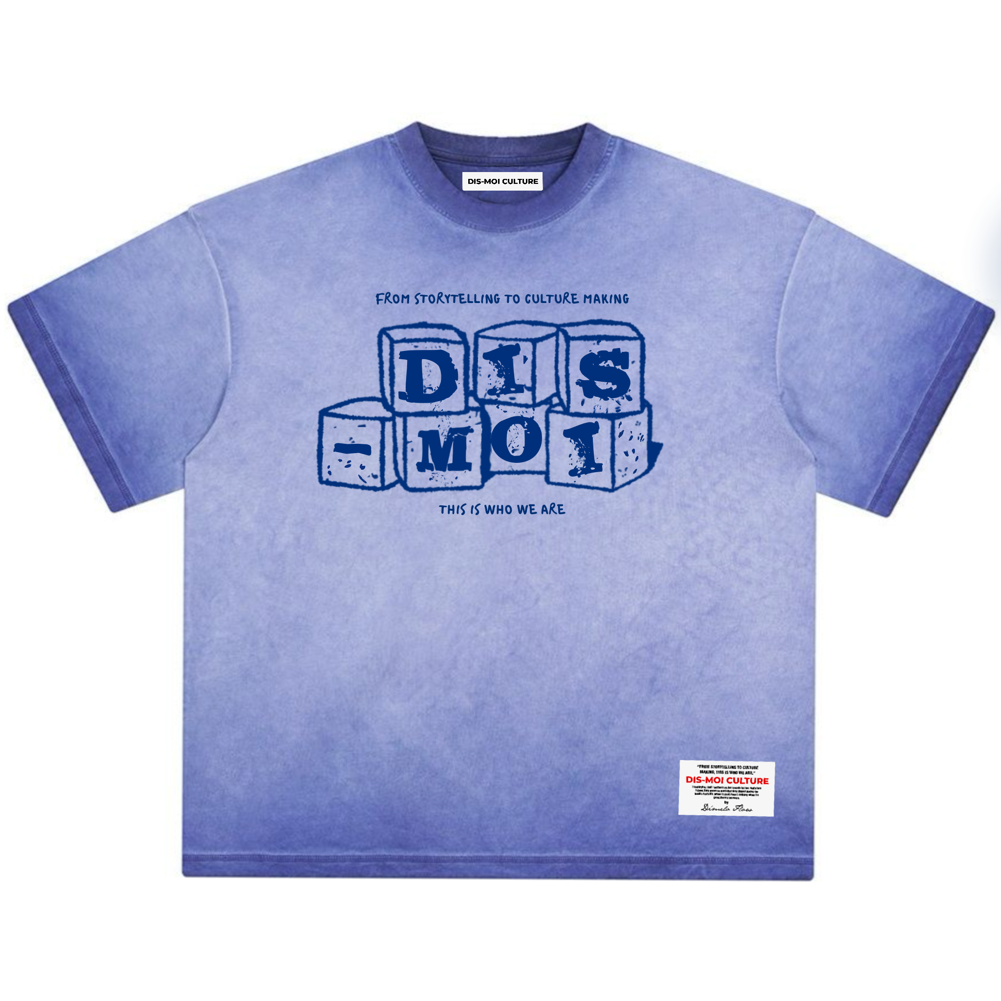 Inspired by mist and urban movement. Blue gradient T-shirt featuring the block-style “Dis-Moi” graphic and the statement: “From Storytelling to Culture Making – This Is Who We Are”. A design that blends freshness and character.